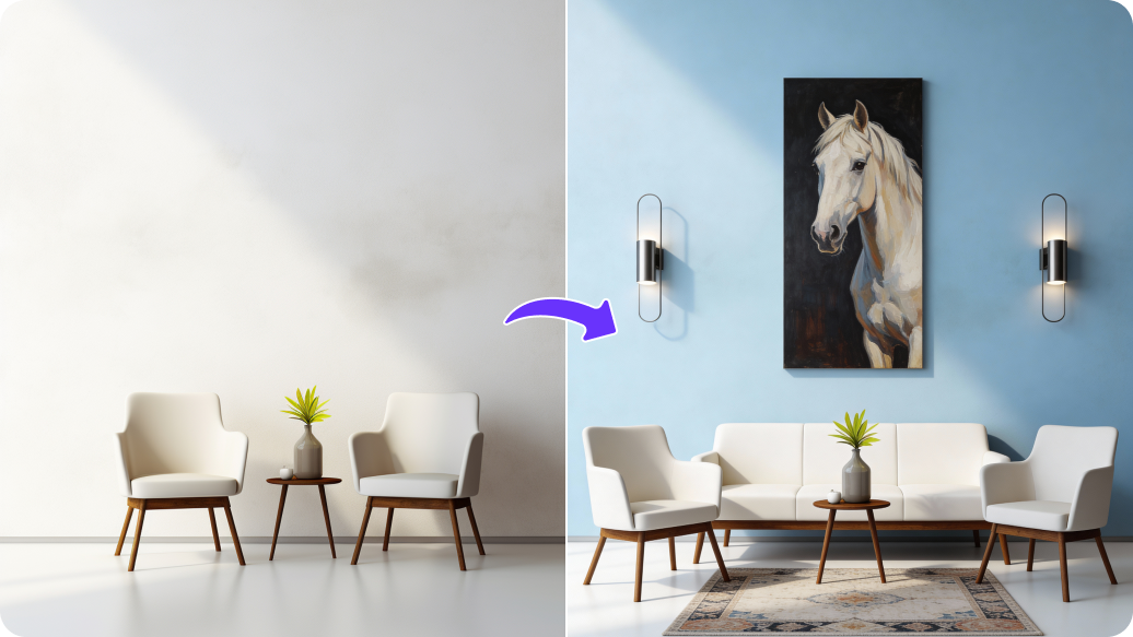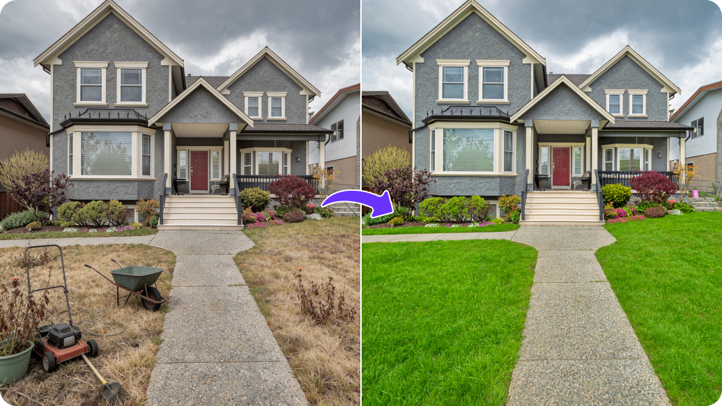 Present your creative idea with our AI house photo editor. Make beautiful before-and-afters and create a high-end portfolio.