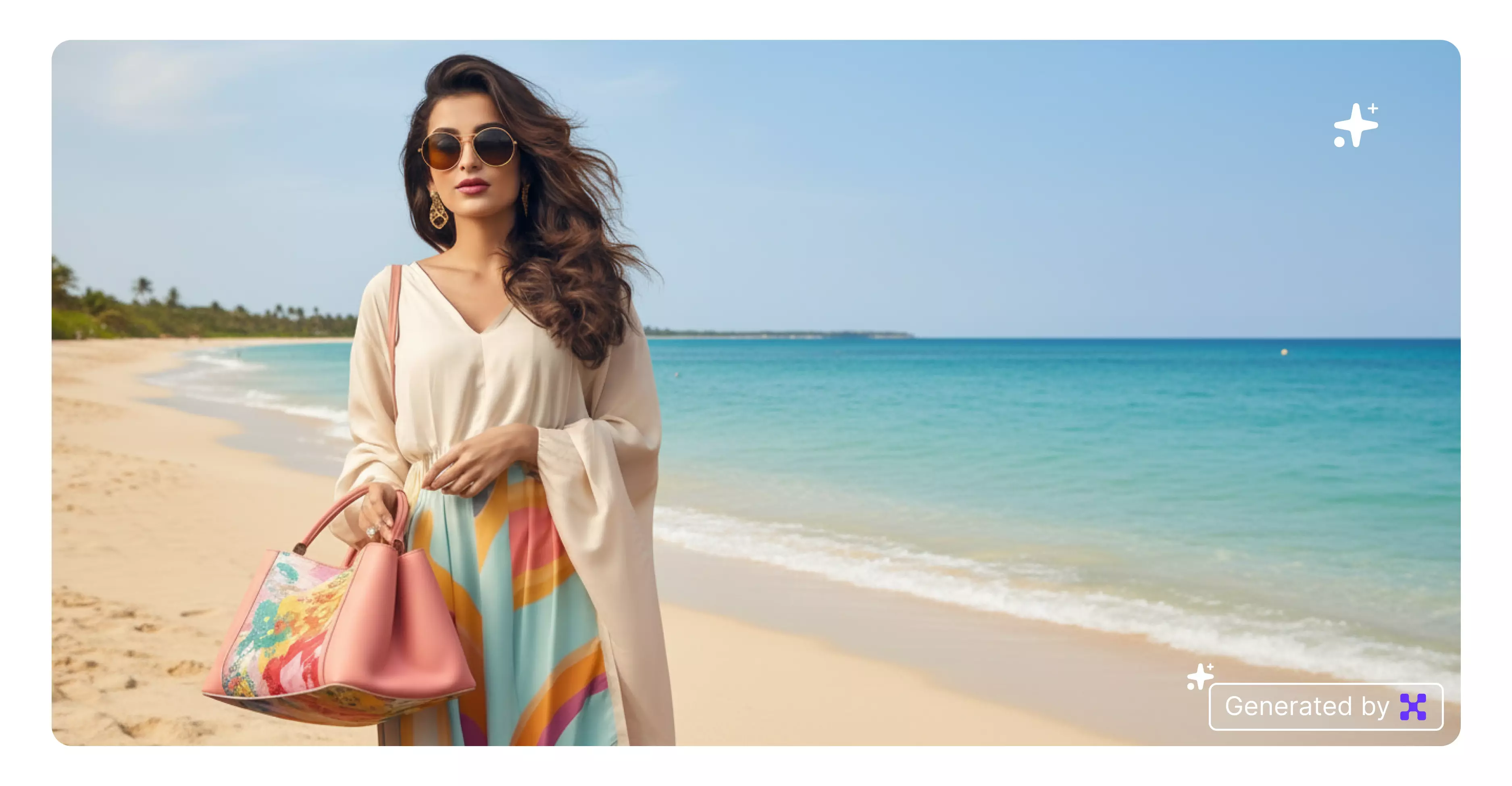 Set the background to a sunny beach with clear blue water and light sand tones. It adds freshness and a carefree summer feeling.