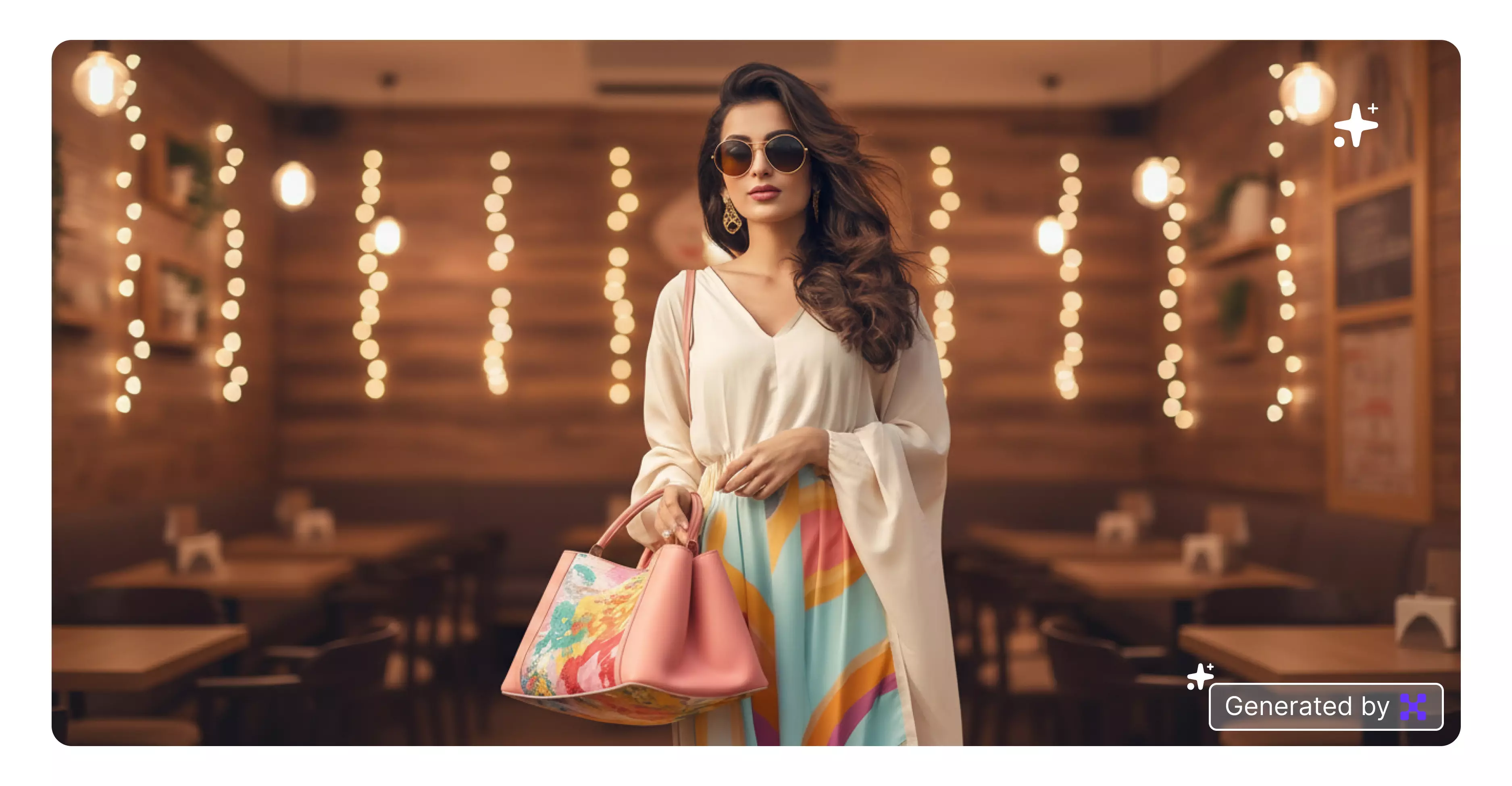 Add a warm indoor café setup with fairy lights, wooden textures, and blurred tables in the background. Perfect for friendly, relaxed portraits.