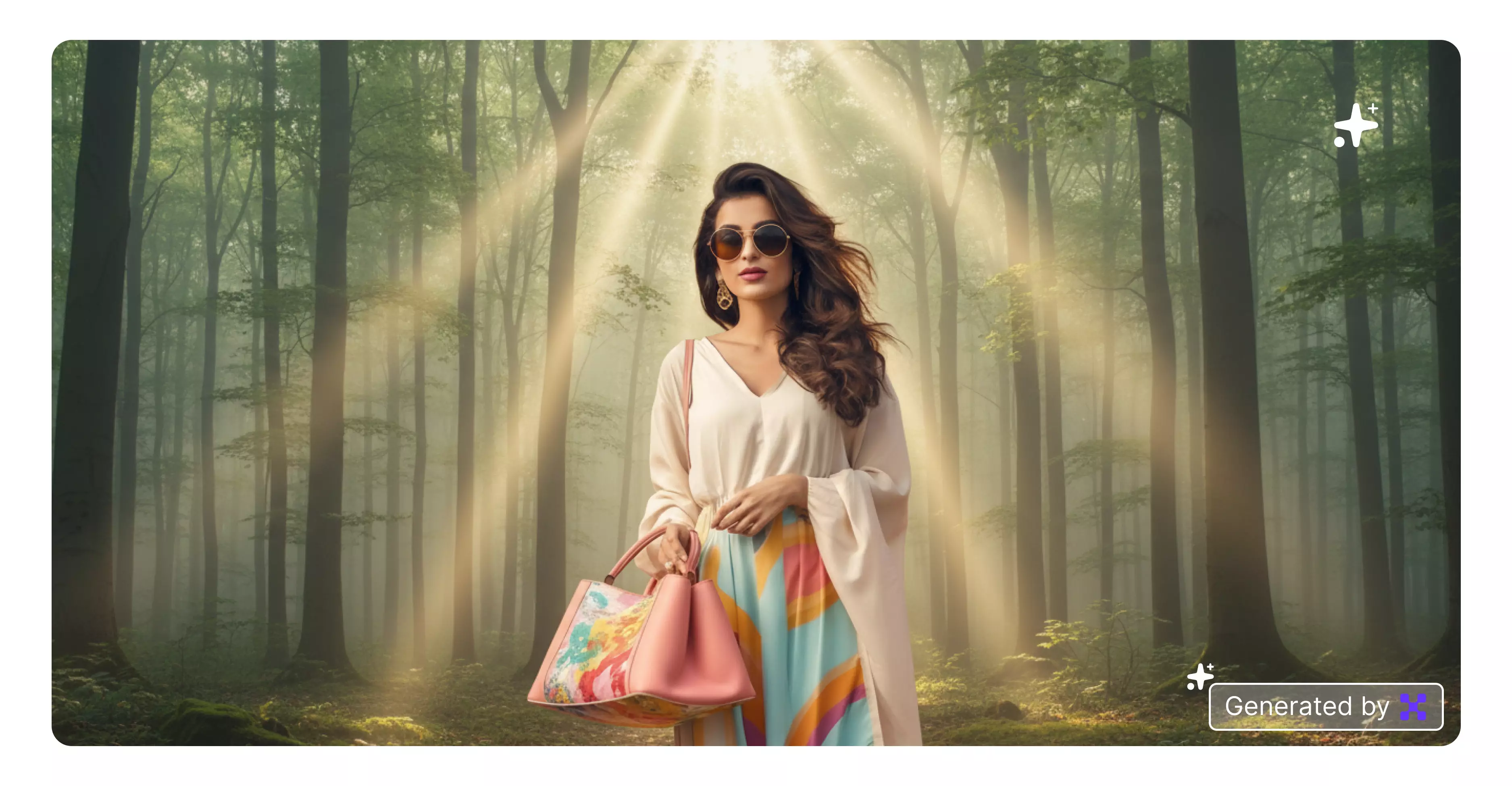 Create a soft forest background with tall trees, glowing light rays, and misty air. It makes the portrait look dreamy and cinematic.