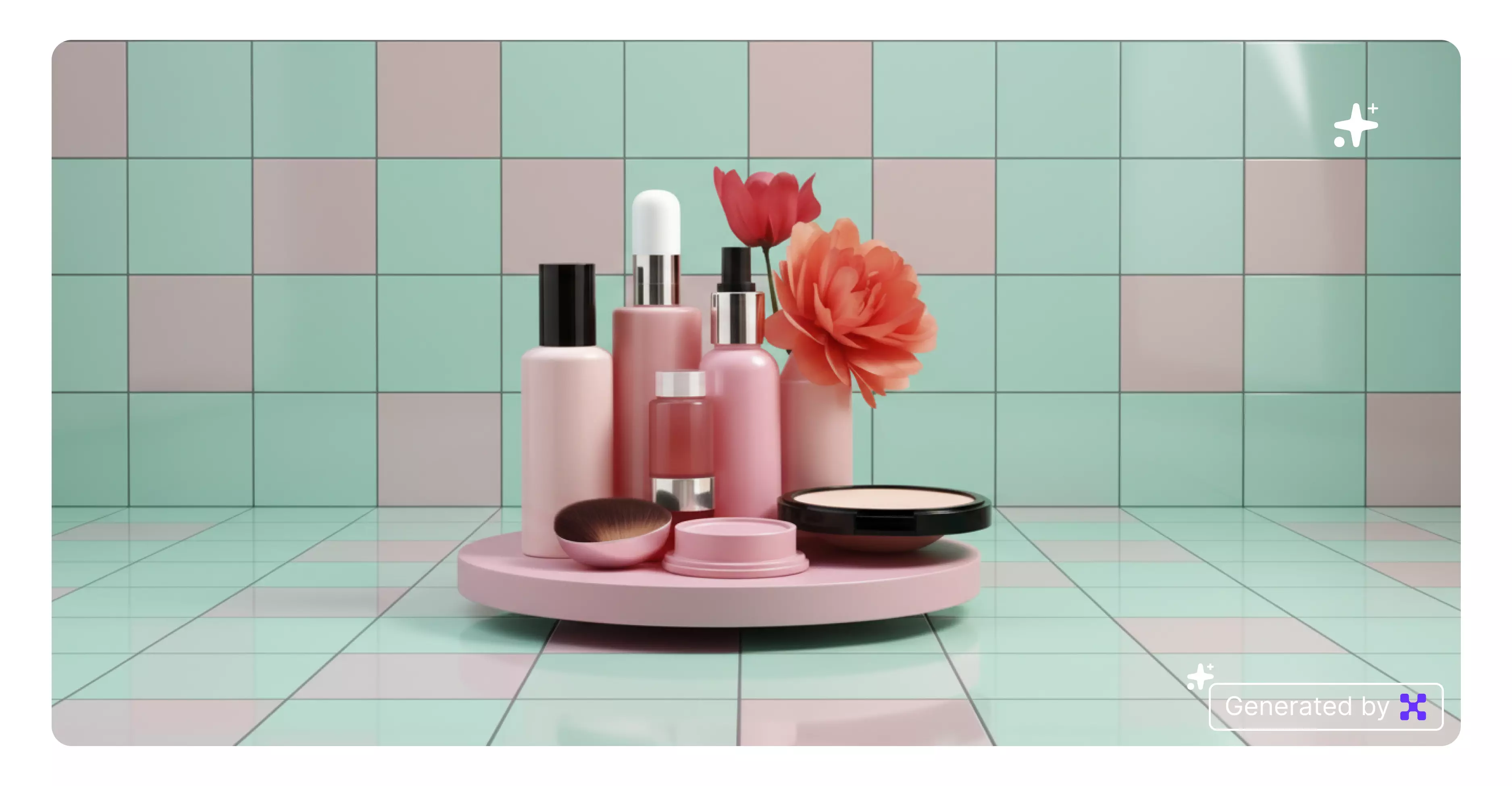 Set the background to glossy pastel tiles (mint or blush) with subtle reflections and clean studio lighting.