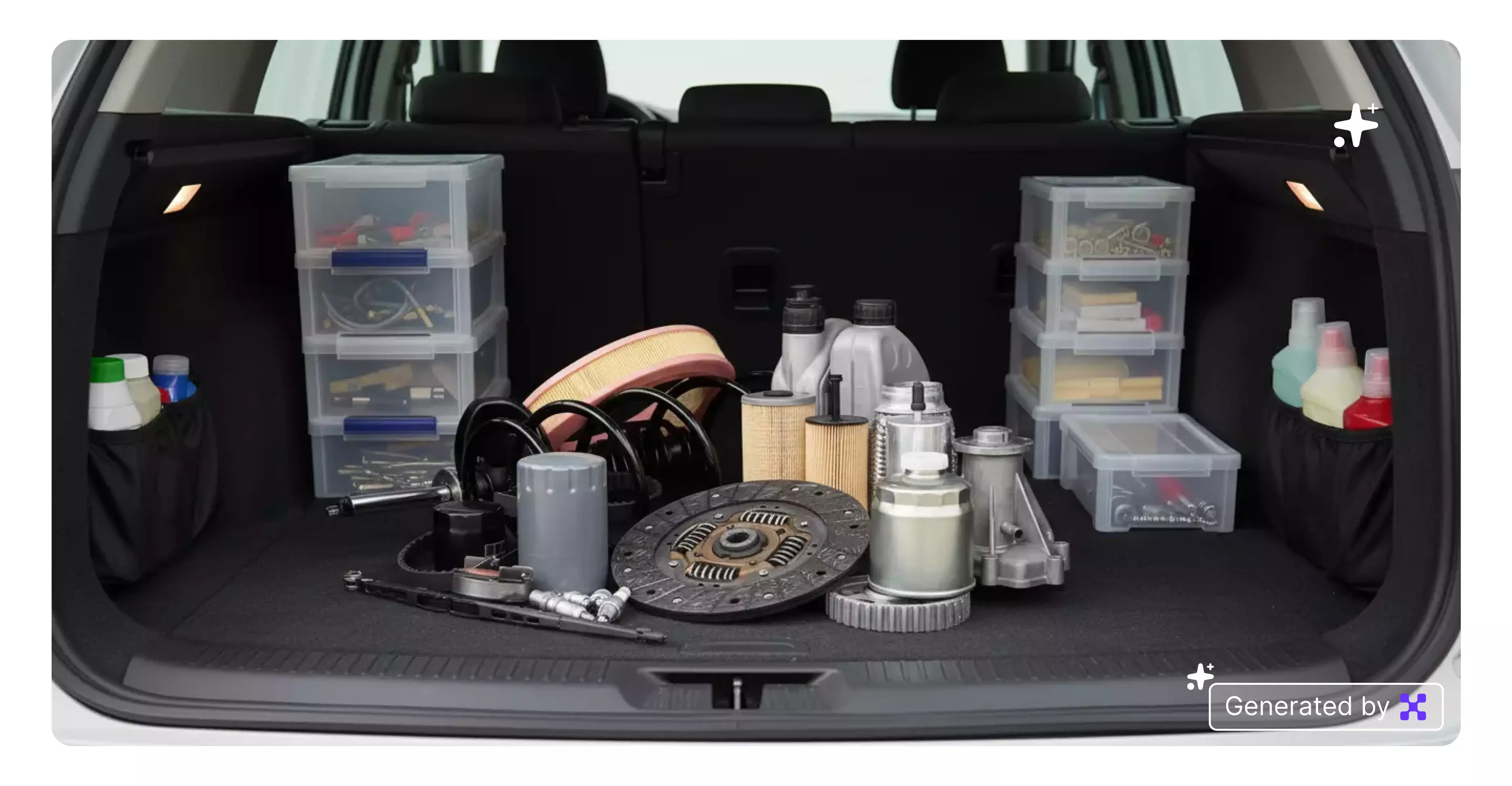 Change the background to a car trunk with organized storage boxes and subtle shadows. Keep lighting soft to enhance product detail.