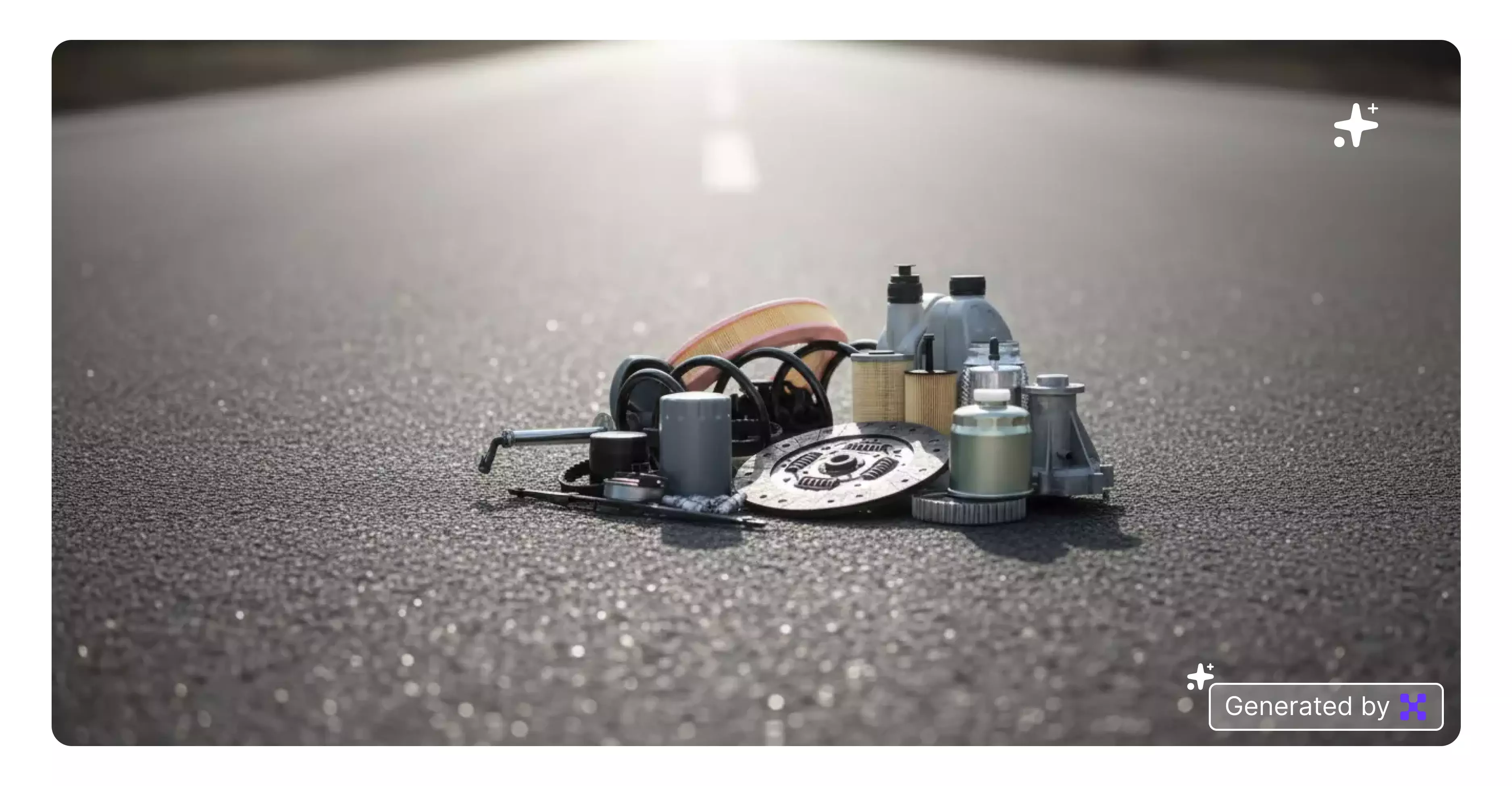 Set the background to a clean asphalt road surface with subtle sunlight and soft focus. Add faint reflections and neutral tones to keep it realistic.