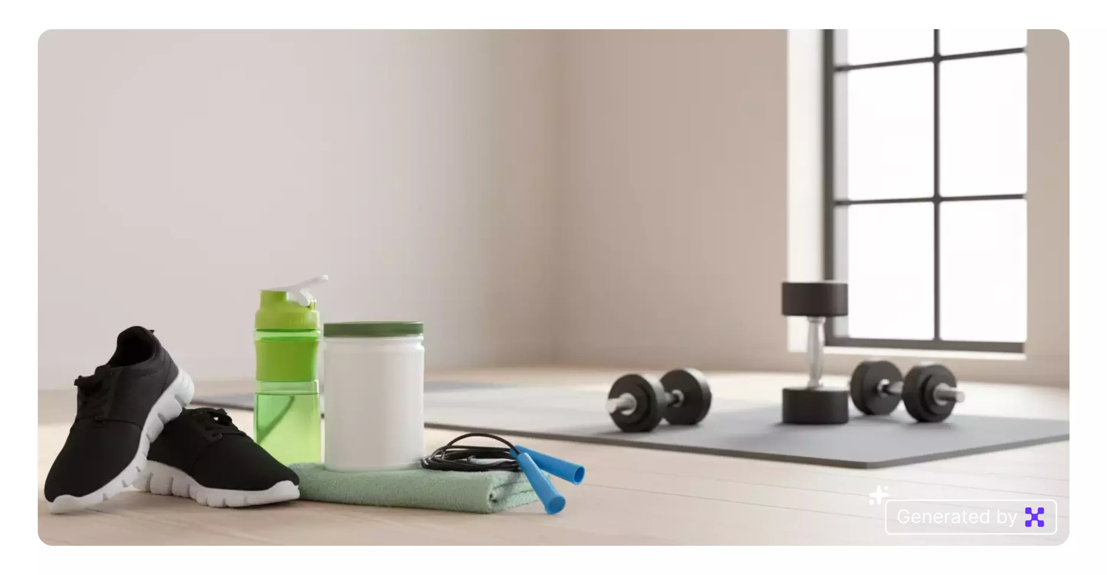 Replace the background with a modern home corner setup showing a mat, dumbbells, and window light. Keep the environment soft and minimal.