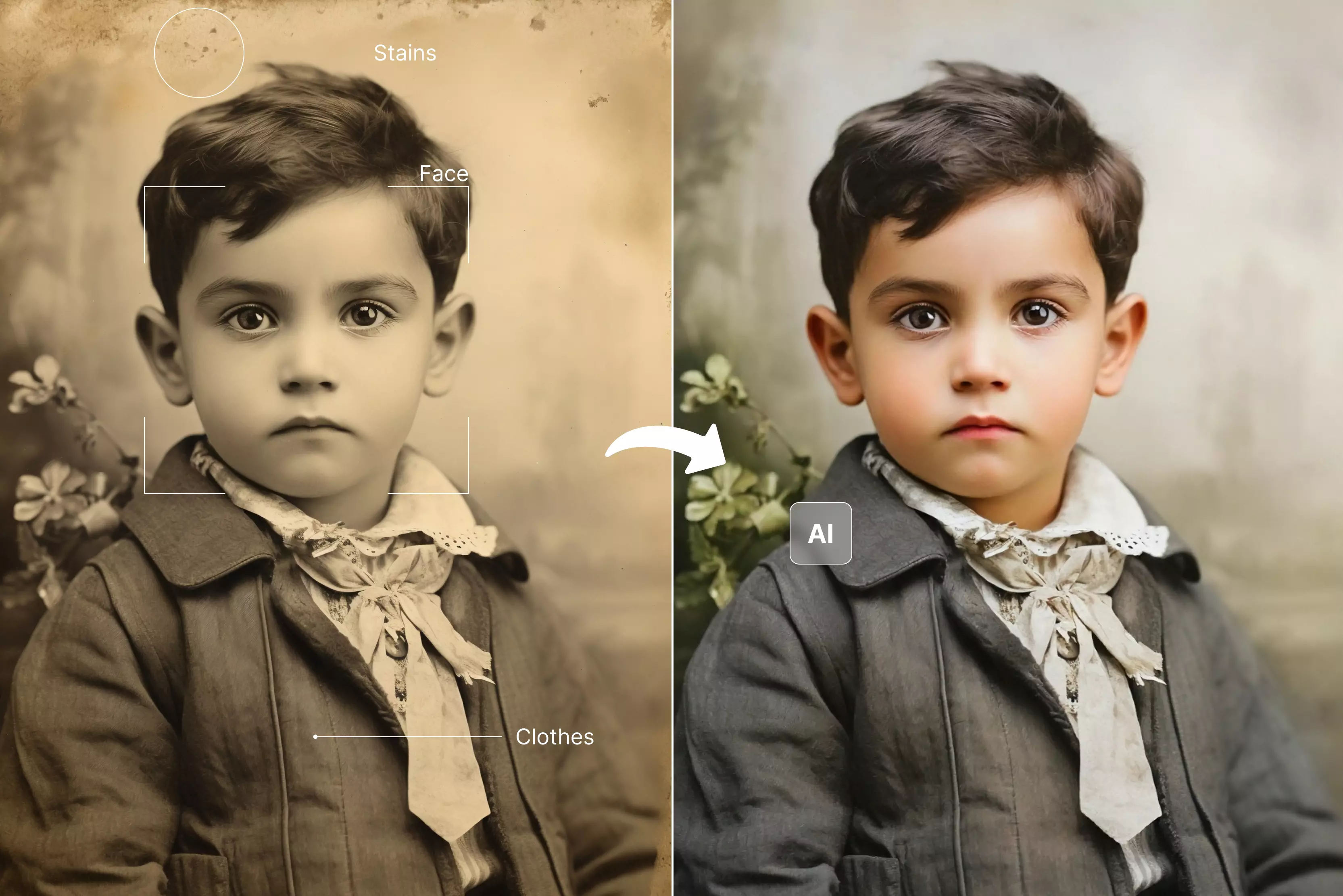 AI scans the image for missing pixels, noise, scratches, and faded spots, then compares them with patterns learned from thousands of photos to fill in the gaps.