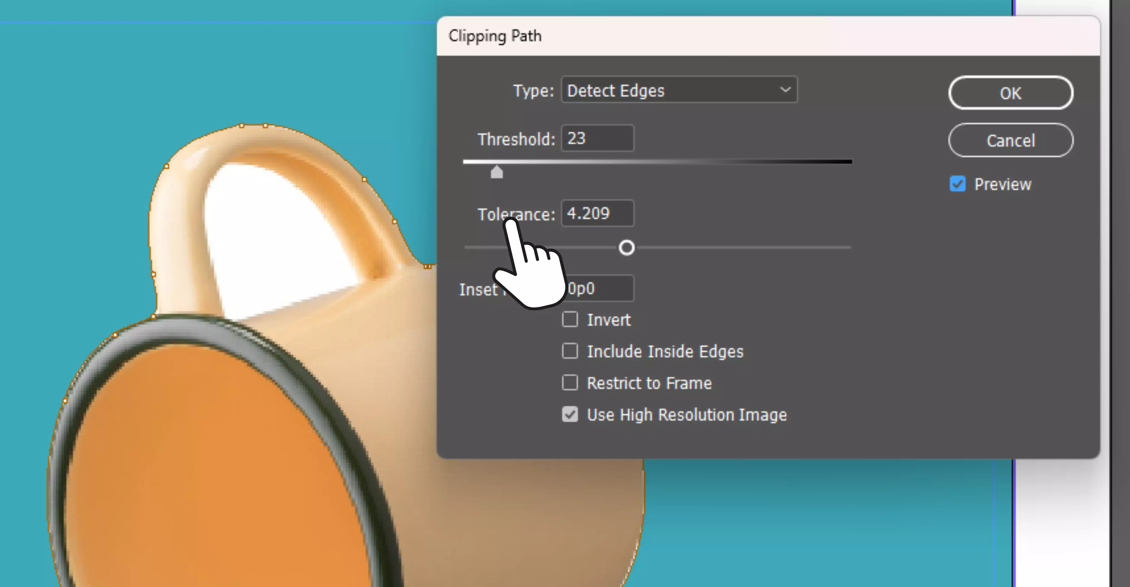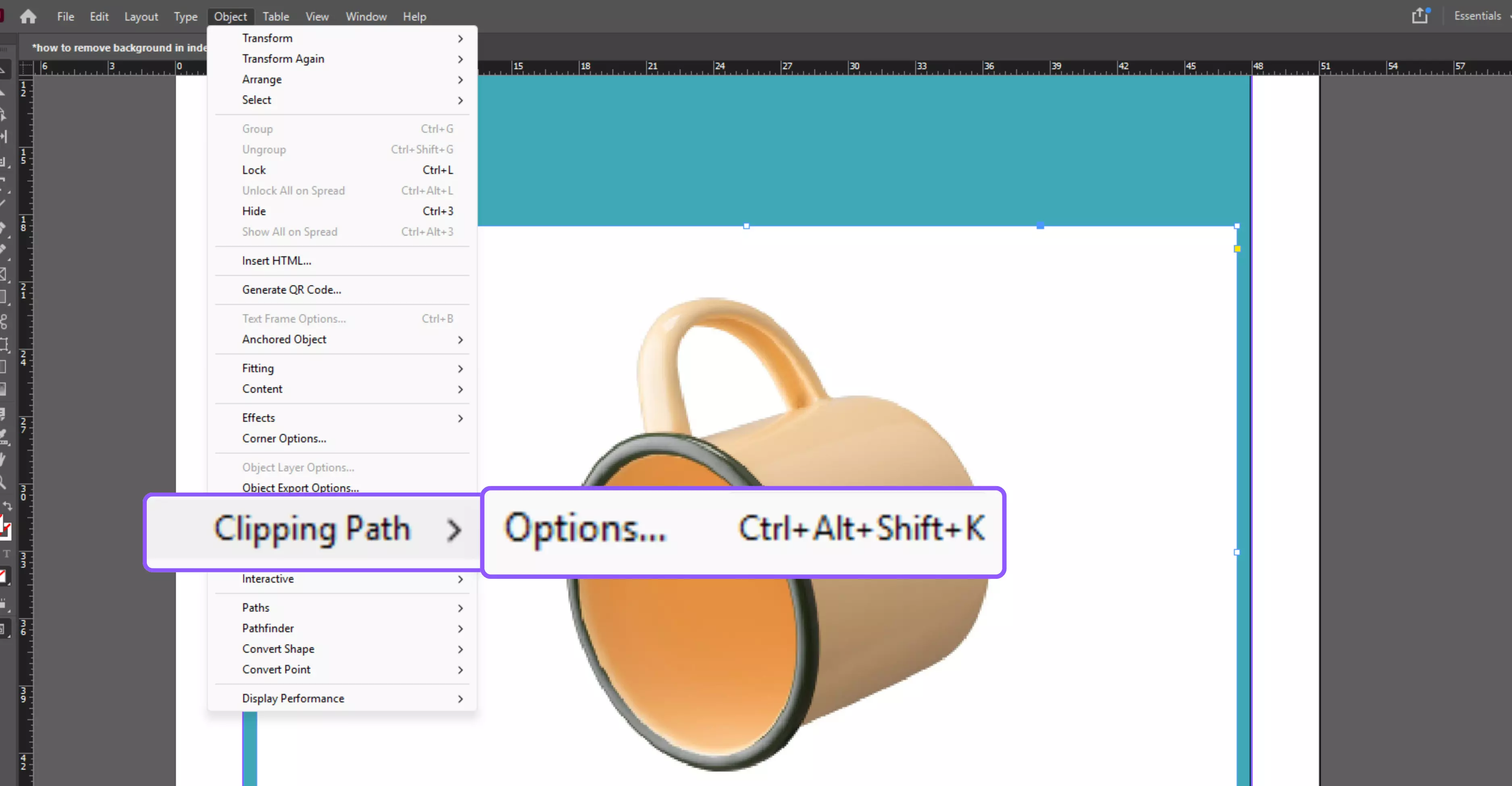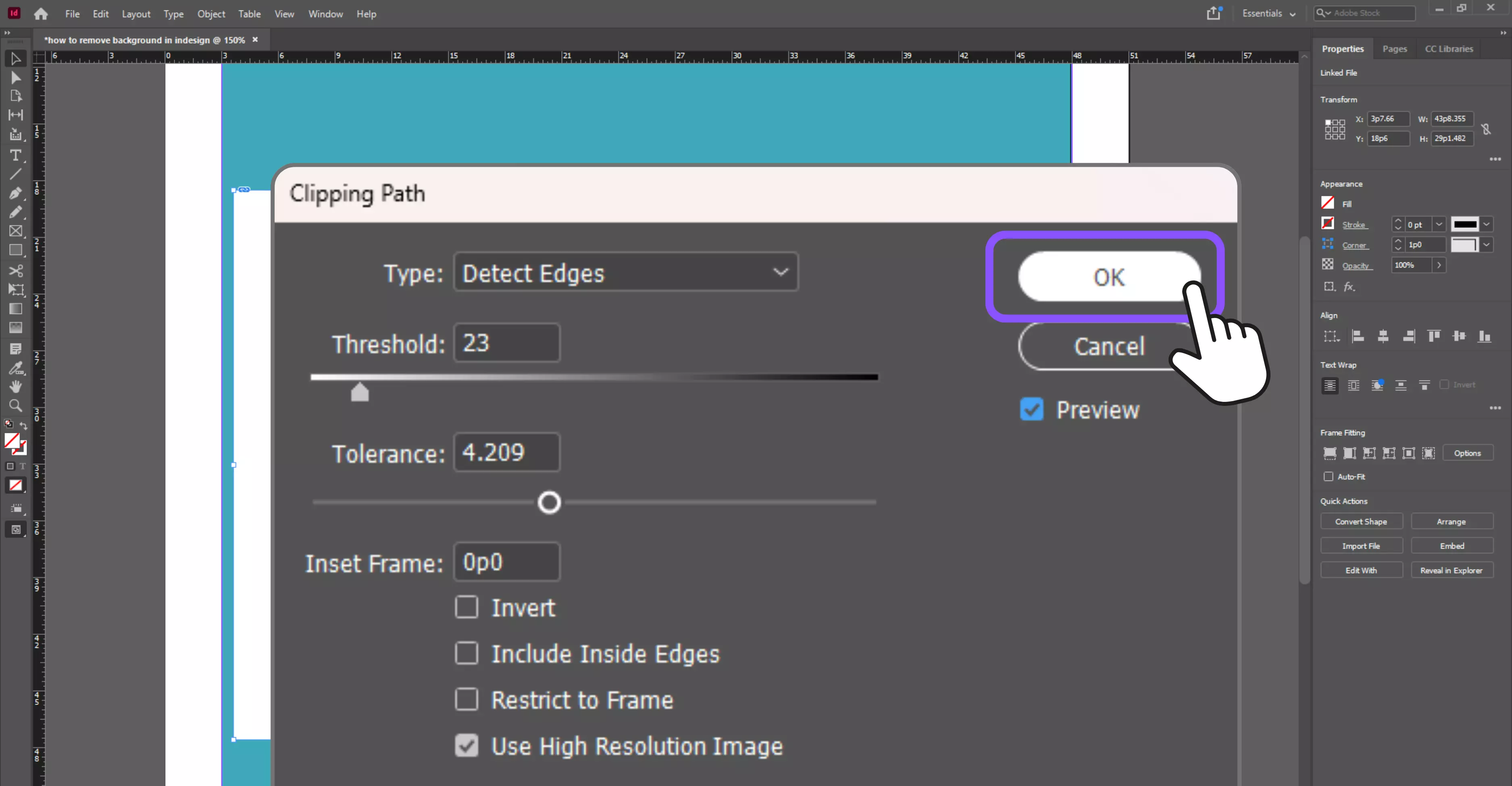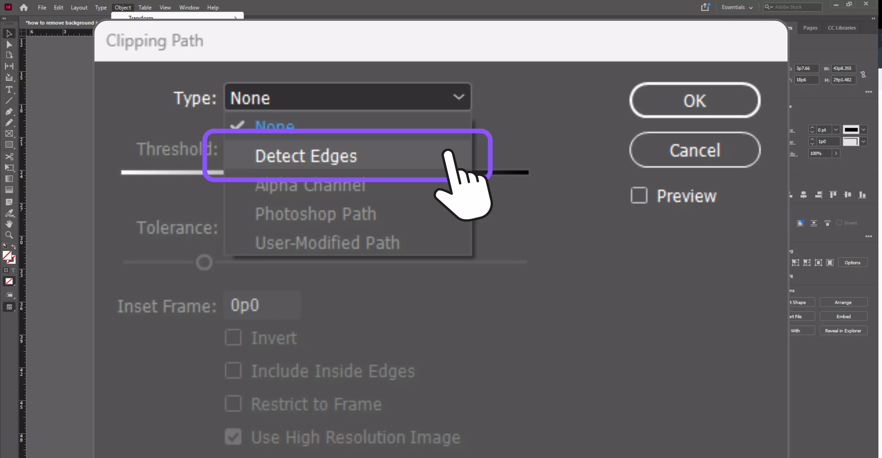 Select your placed image, then go to Object → Clipping Path → Options. From the “Type” dropdown, choose Detect Edges. Adjust the sliders until the background gets removed. This works best when the subject has strong edges against the background.