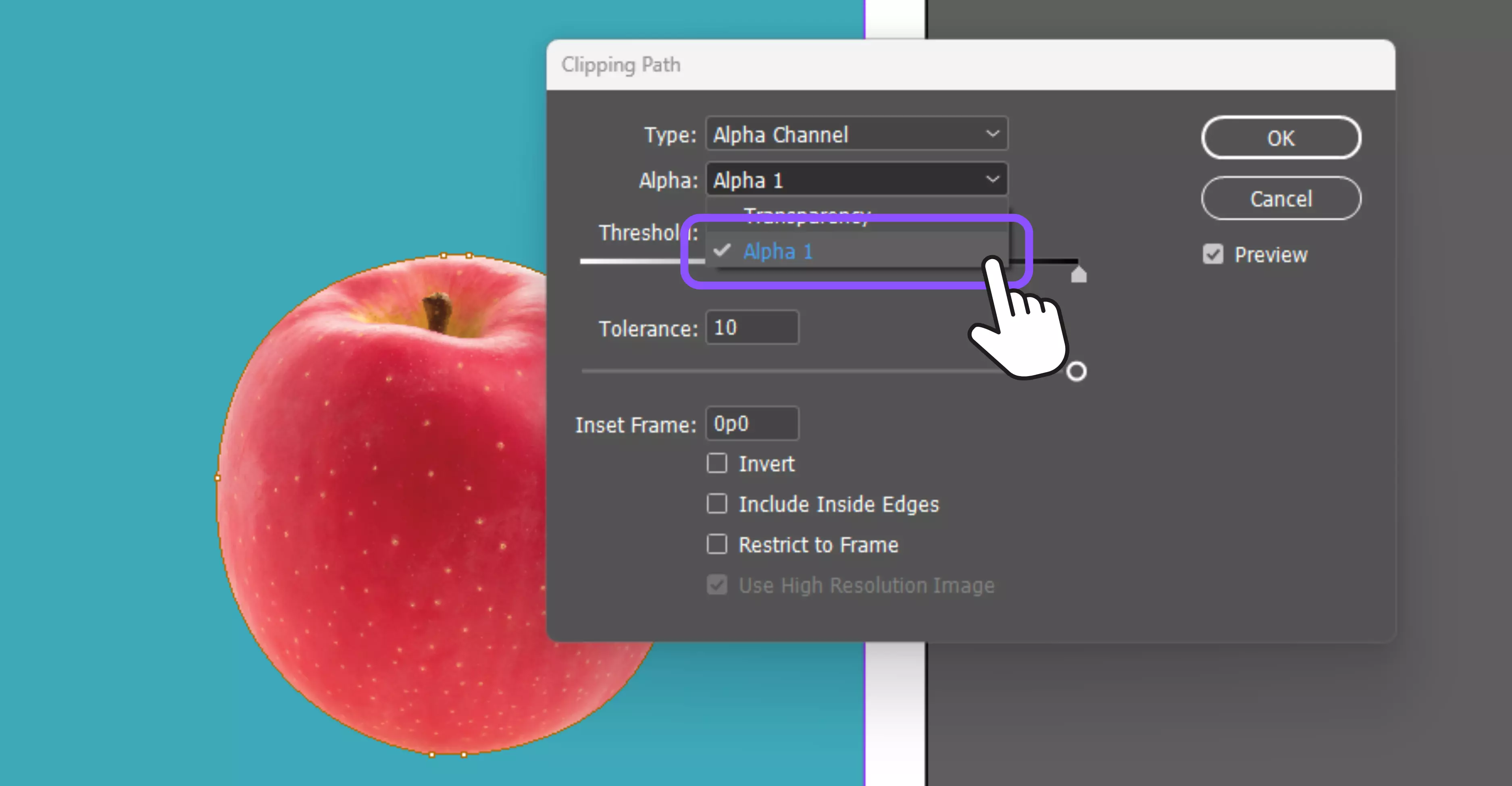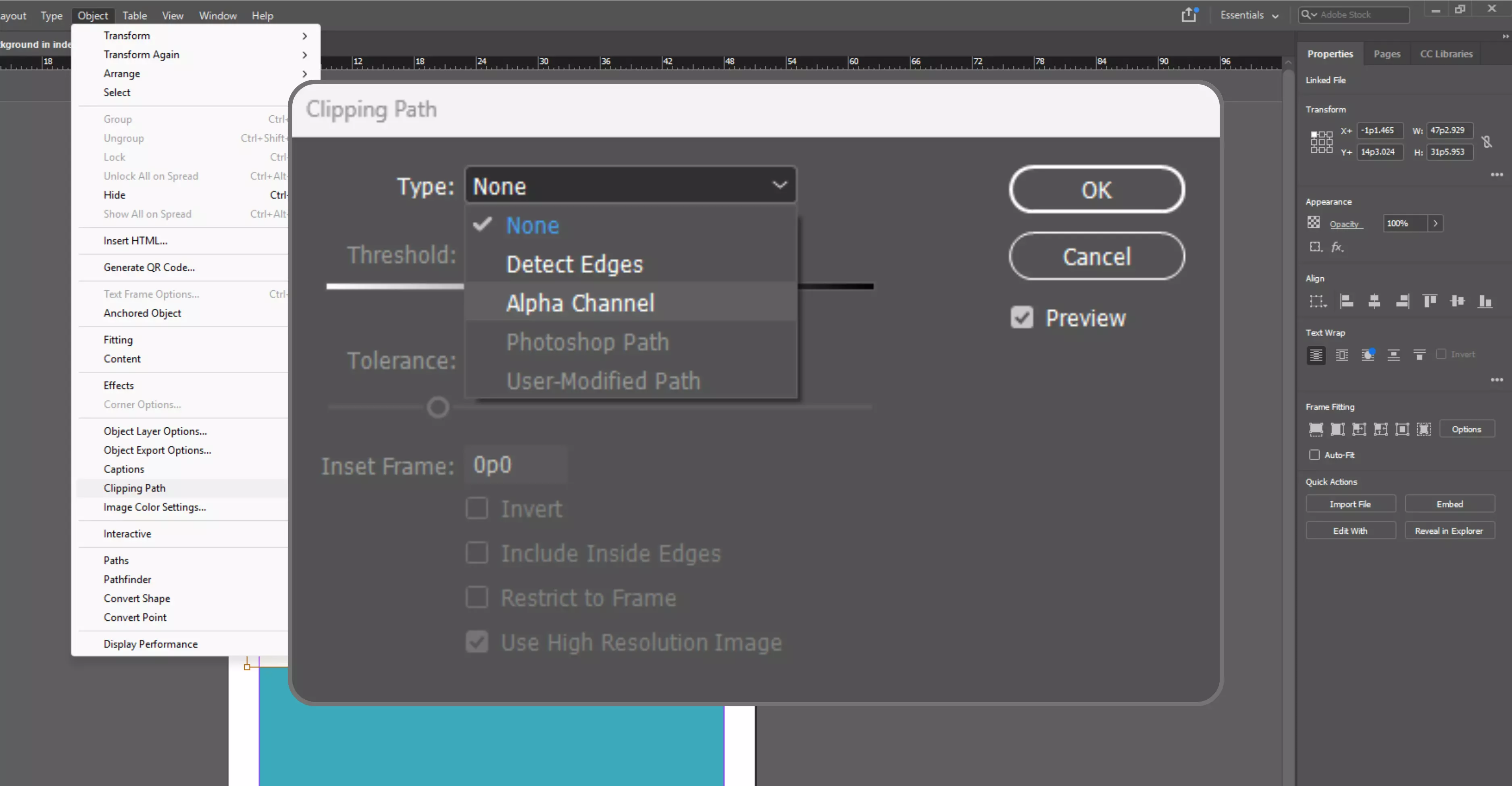If the file has an Alpha Channel saved in Photoshop, InDesign 2020 can use it directly. Place the PSD or TIFF into your layout, open Clipping Path Options, and choose Alpha Channel. This applies the transparency exactly as it was created in Photoshop.