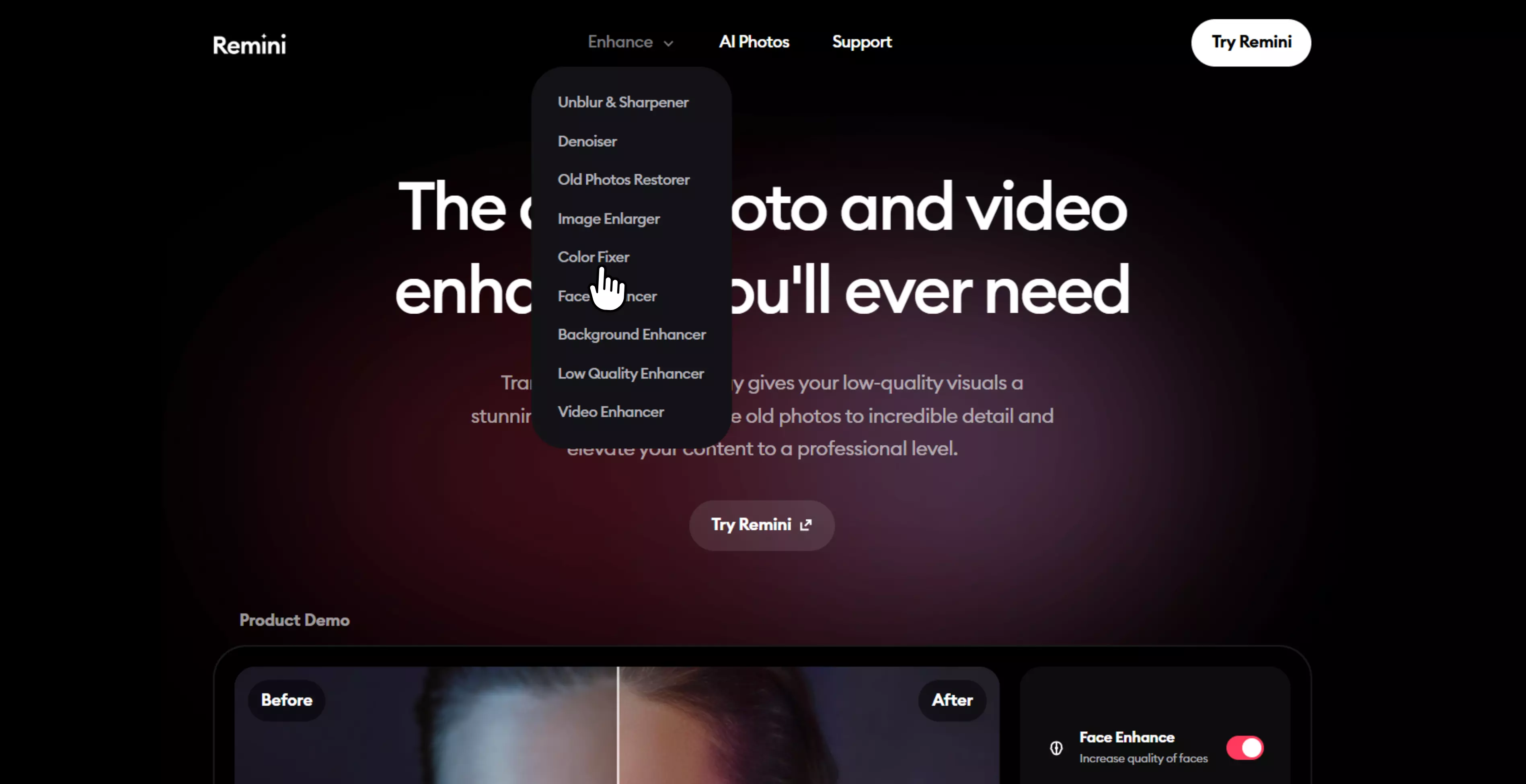Step 1: Visit the official website of Remini and click on Enhance> Color fixer.
